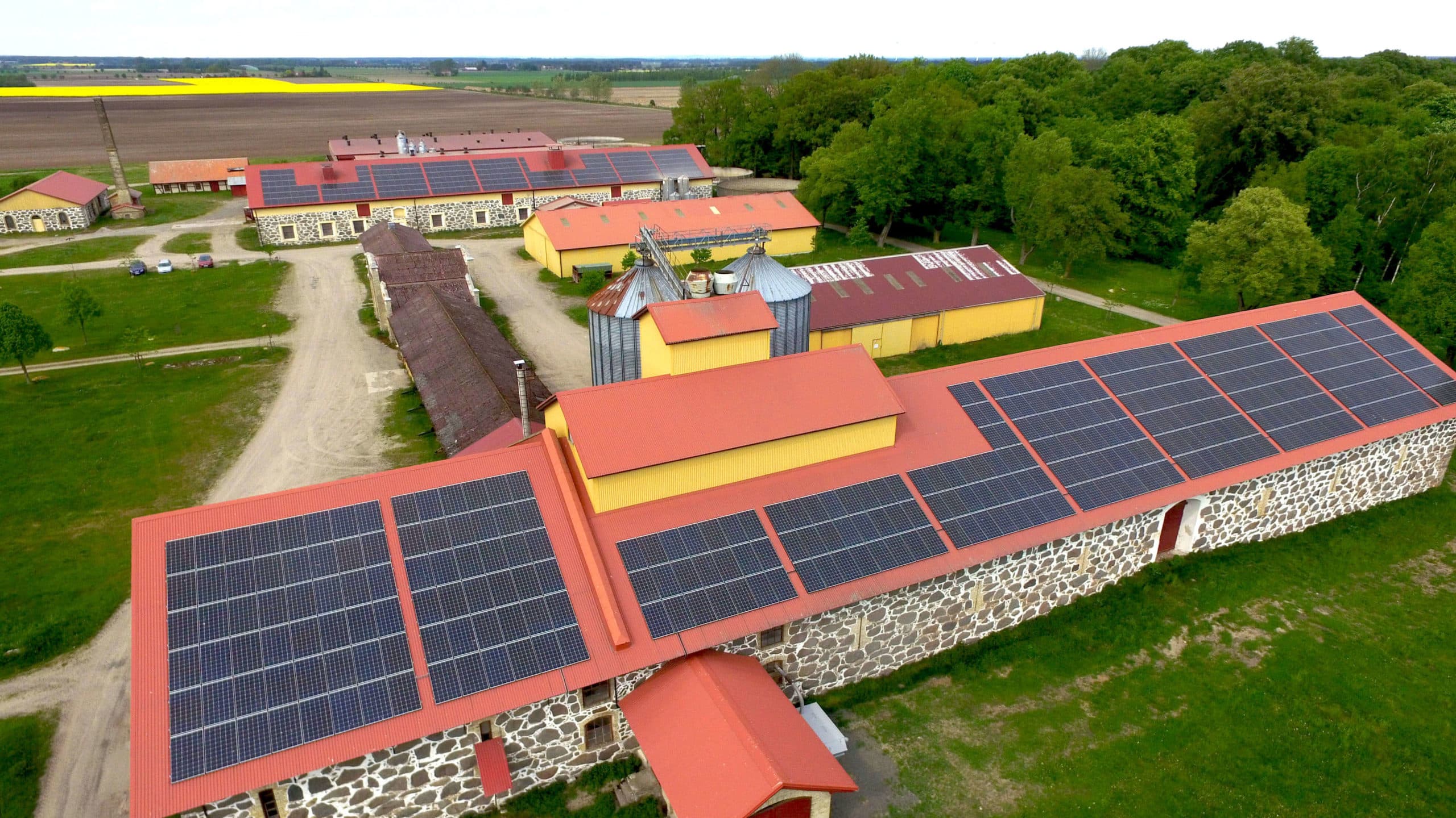 The solar cells were mounted on two separate roofs, both facing south and with an optimal slope. In total, there are 750 solar panels that cover almost 1,300 square meters and produce approx. 200 000 kWh/year. The facility is very visible from the road when passing the estate.